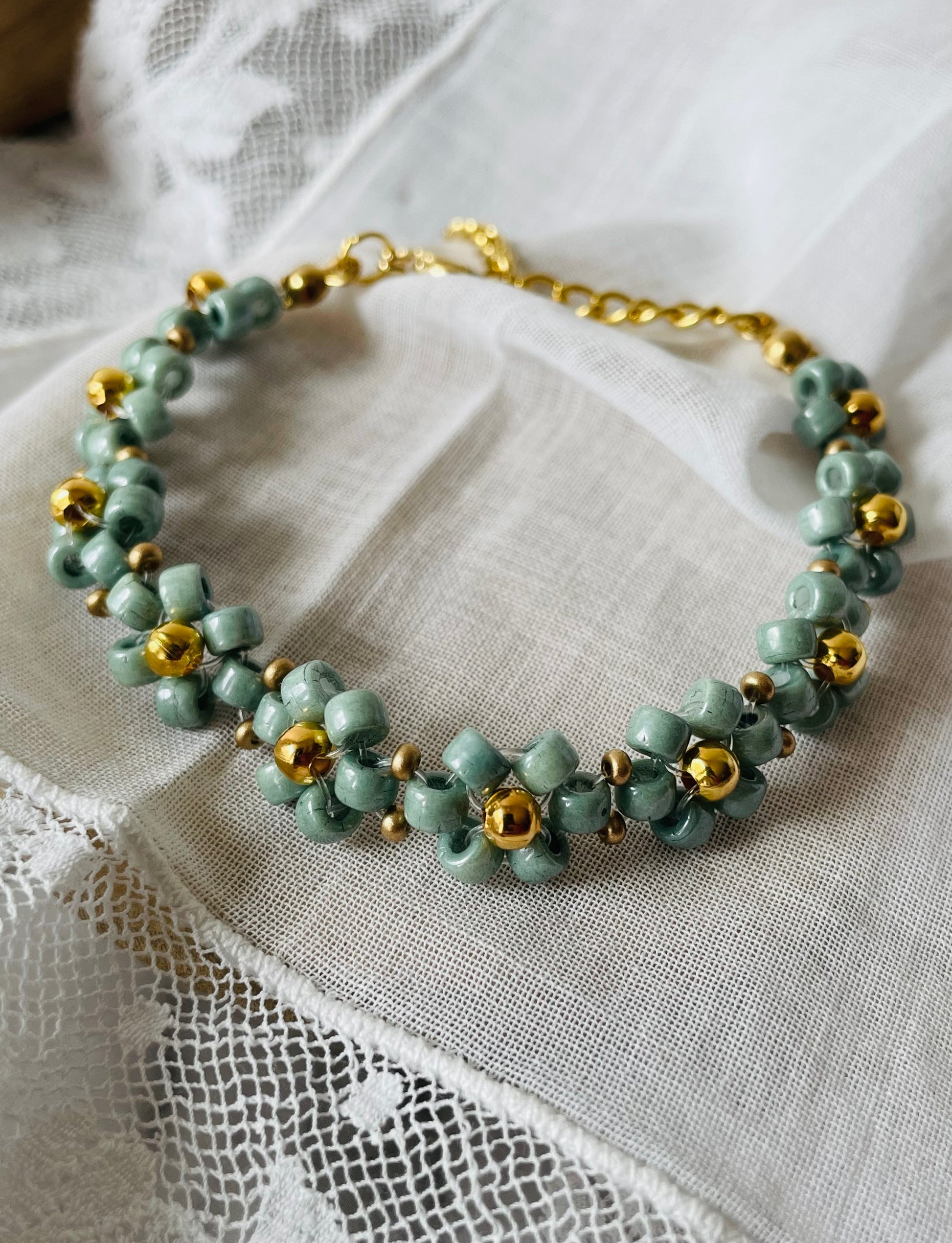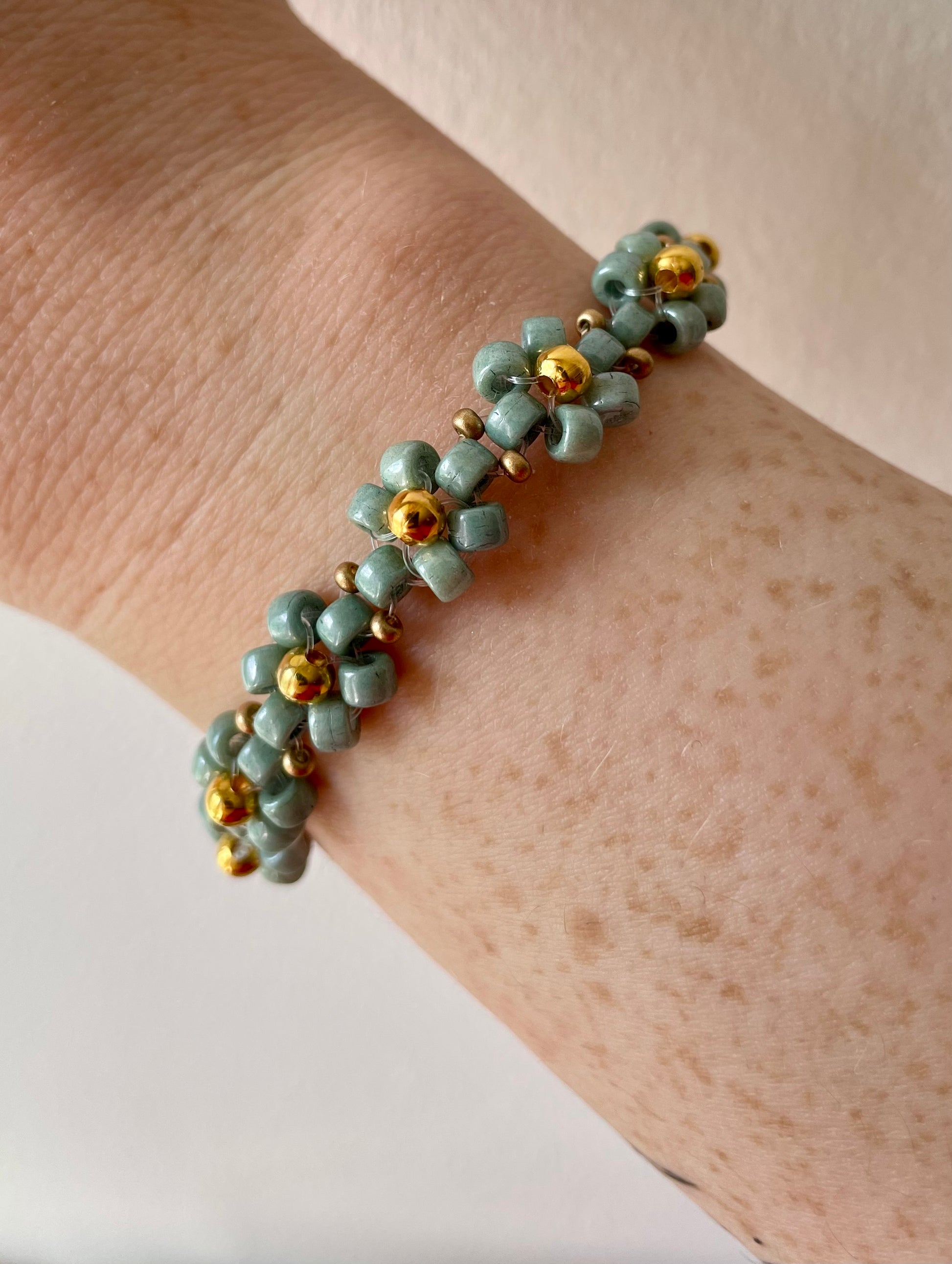 Handmade bracelet with high quality glass & metal beads in a green luster color.