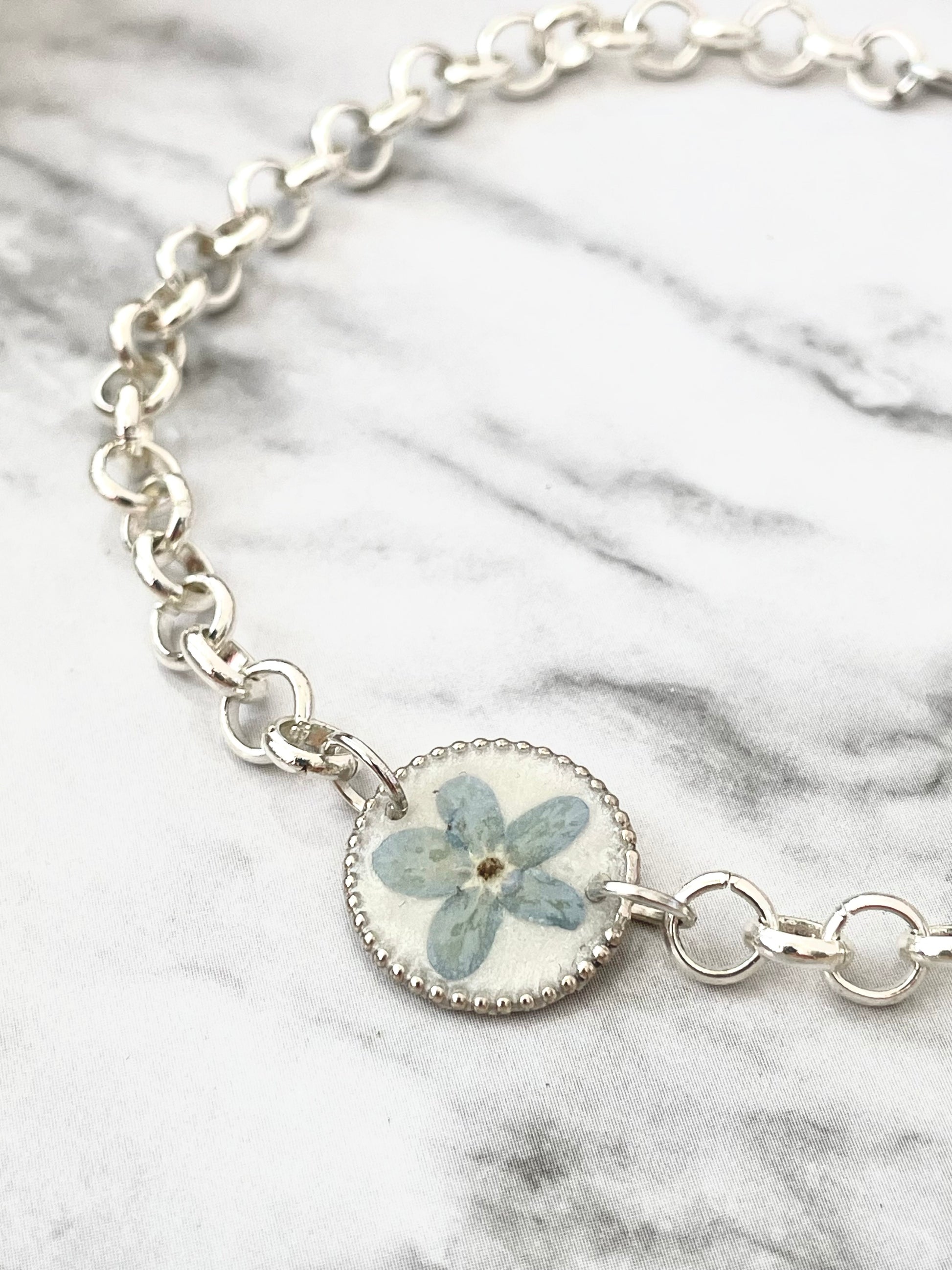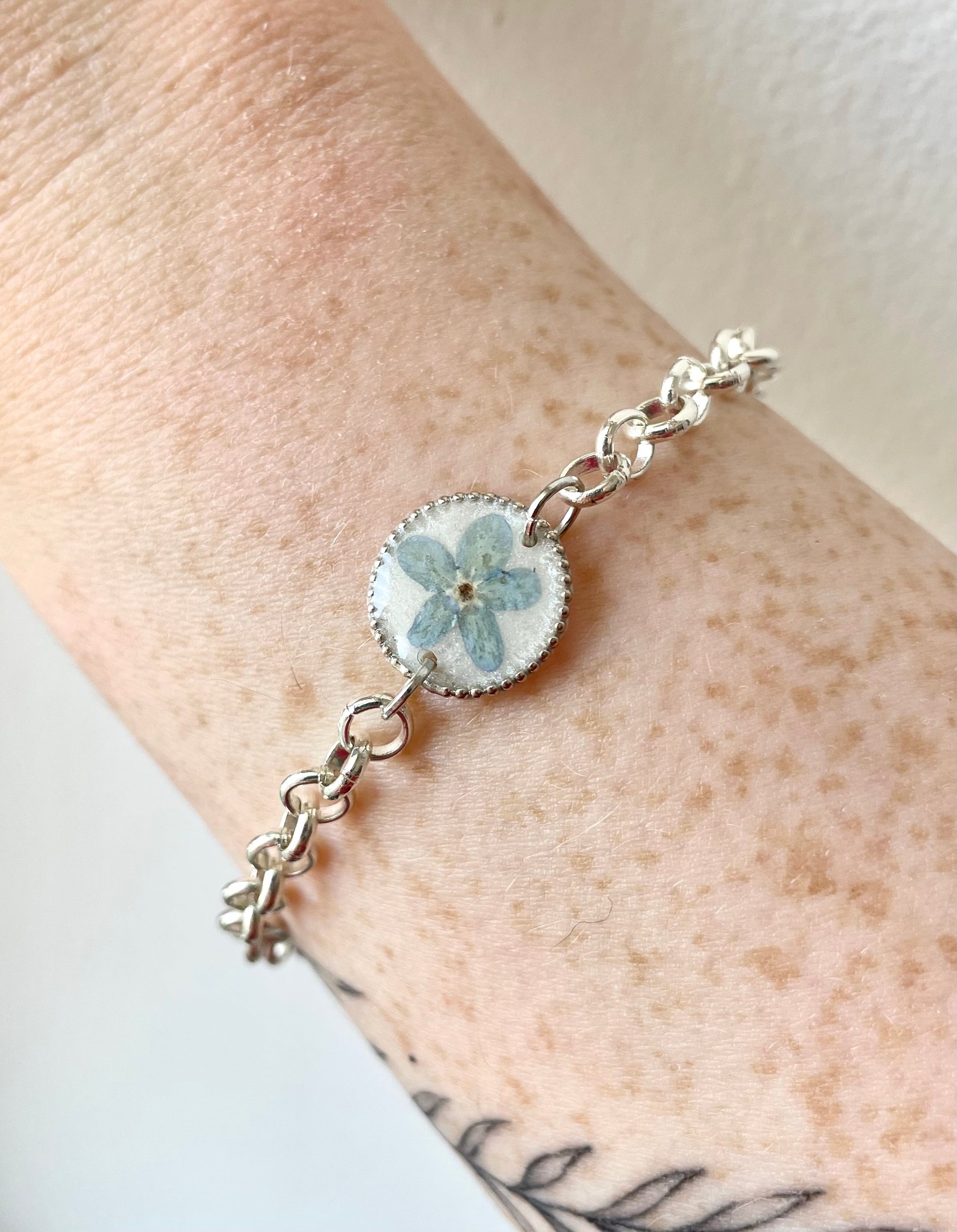 A beautiful and unique bracelet with hand picked flowers from my garden. The round frame is handmade in 925 silver by me.