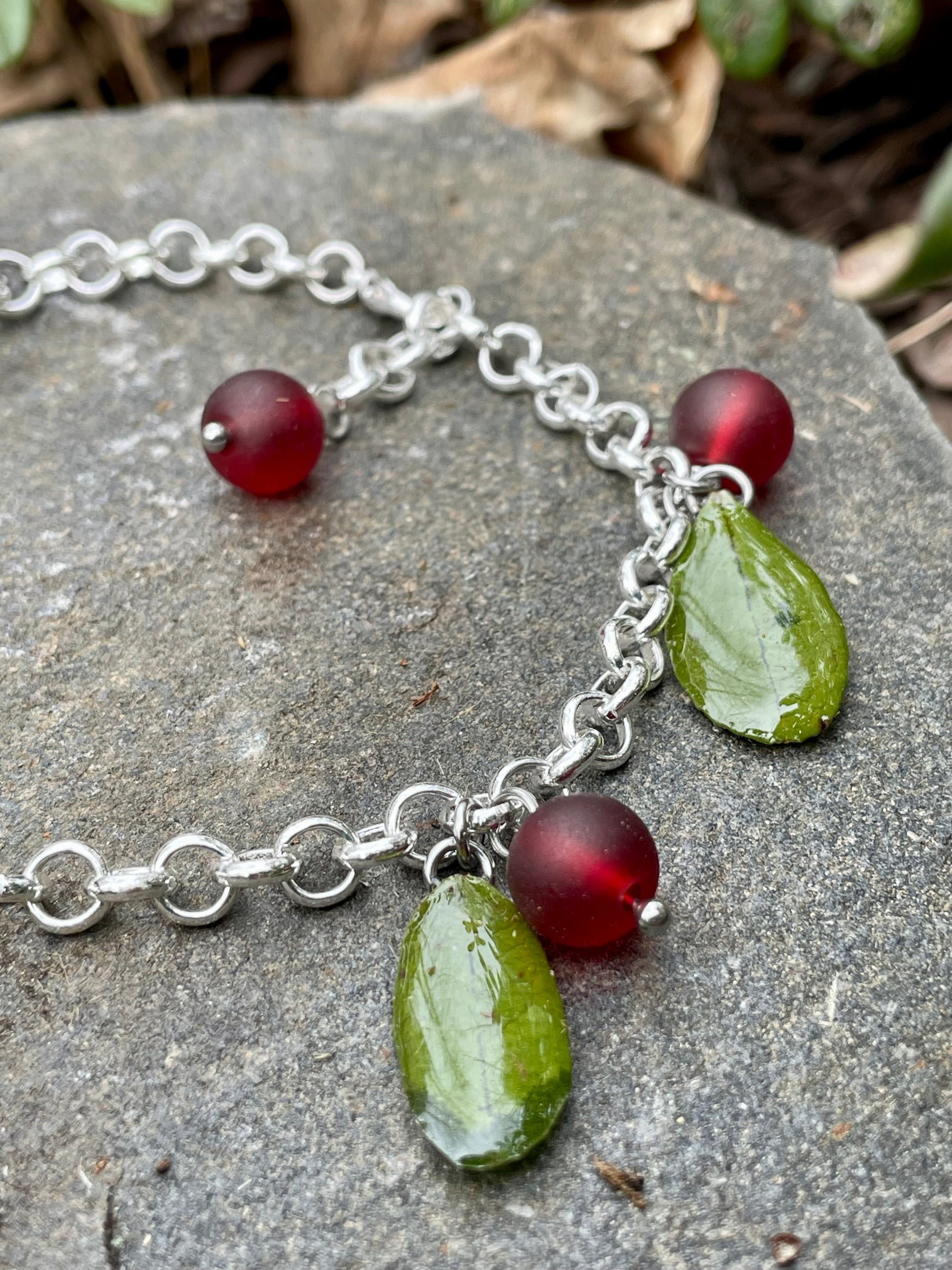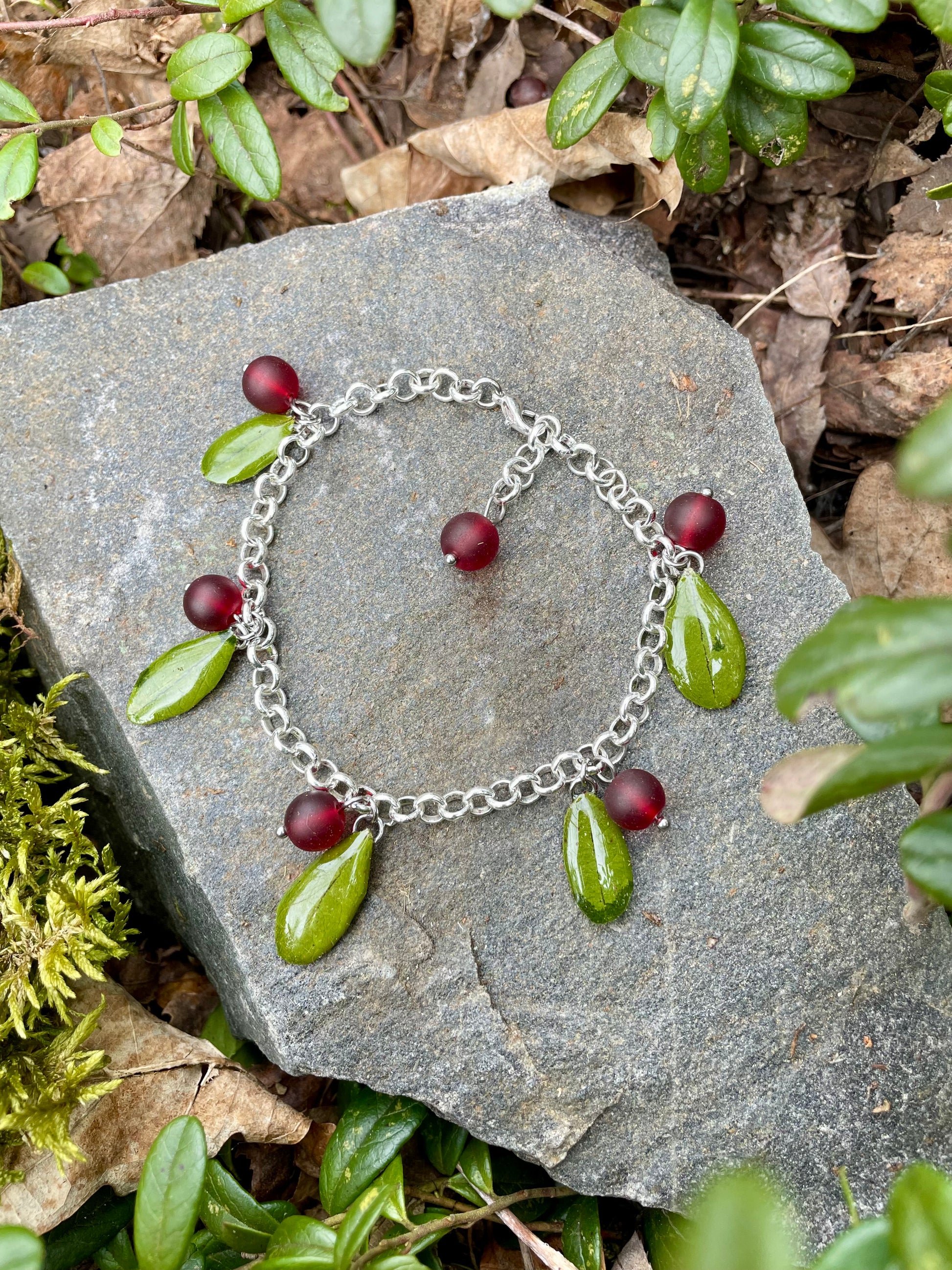 Material: Real lingonberry leaves coated in epoxy resin with red glass beads. All metal parts are a high quality stainless steel, tested and purchased in Finland.