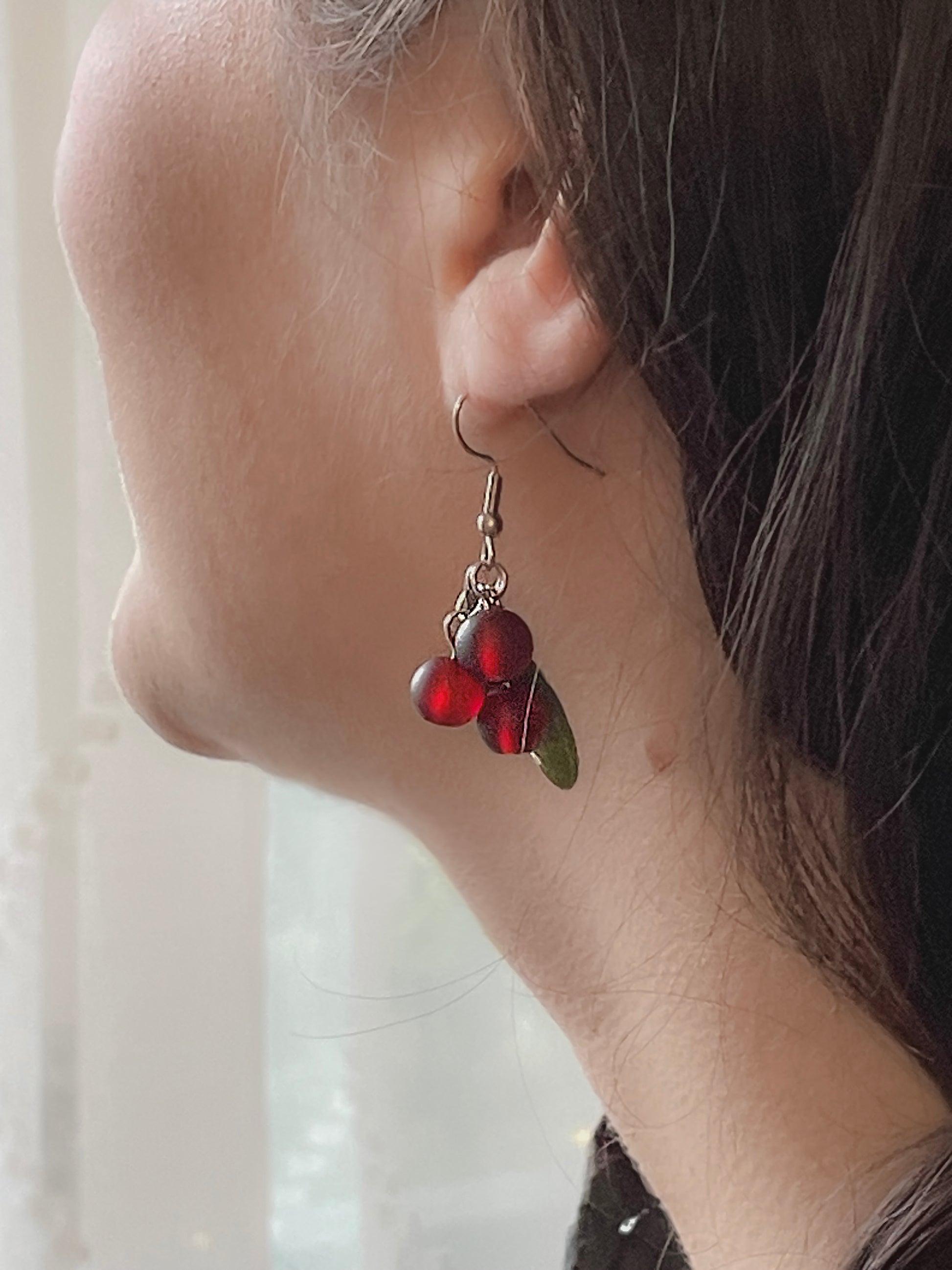 Material: Real lingonberry leaves coated in epoxy resin with red glass beads. All metal parts are a high quality stainless steel, tested and purchased in Finland.