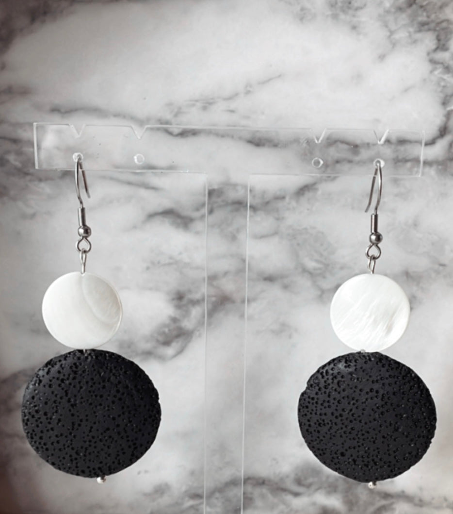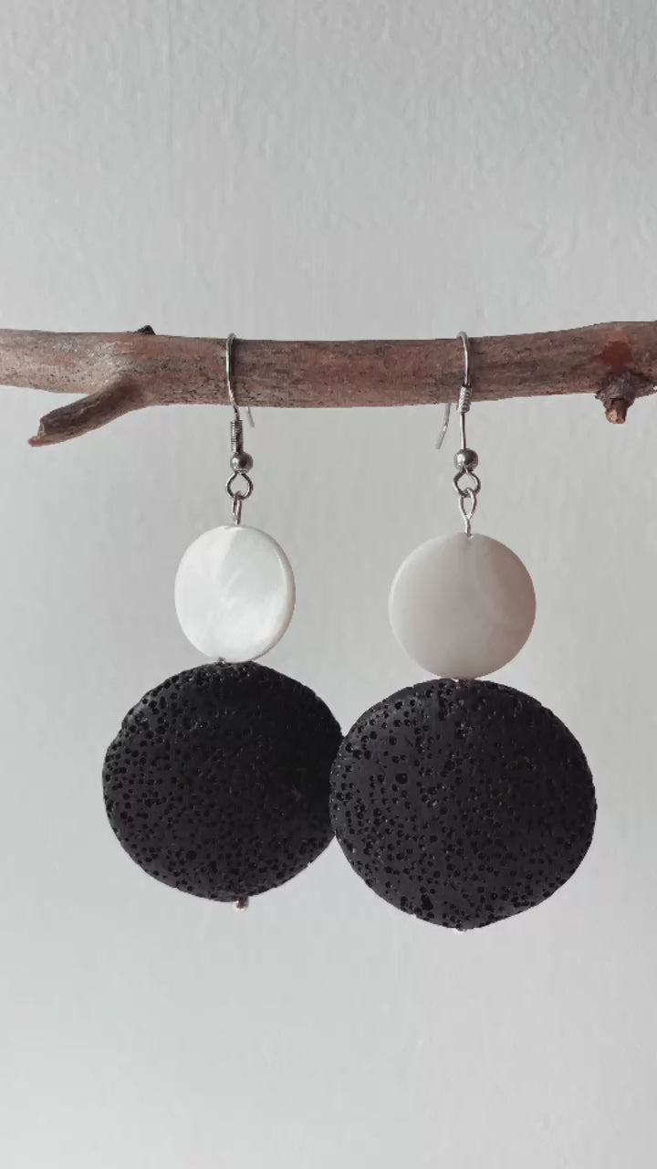 Näissä korvakoruissa on oikeat laavakivi helmet ja uudelleenkäytetyt helmiäishelmet. Inspiraatio om sauna! Kaikki metalliosat ovat laadukkaita, testattu ja ostettu Suomessa.